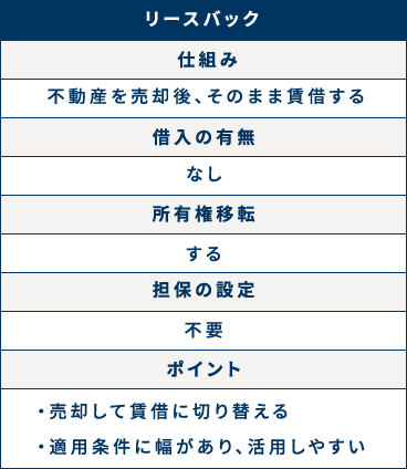 担保の設定や借入は無く、所有権は移転します。資金の使途に制約がなく活用しやすいという特徴があります。
