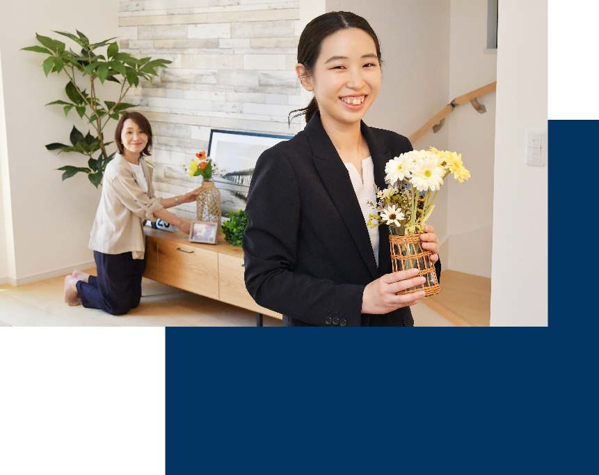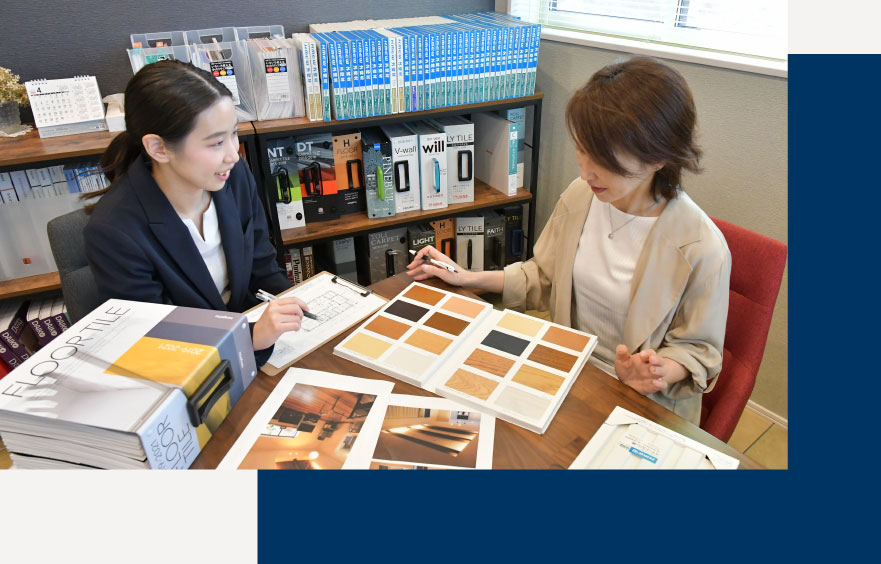 お客様に購入後の生活をイメージしやすくなるようにできる限り丁寧なご説明を心がけ、ライフスタイルのご提案から購入後のフォローまで一生のお付き合いができるように努めます。