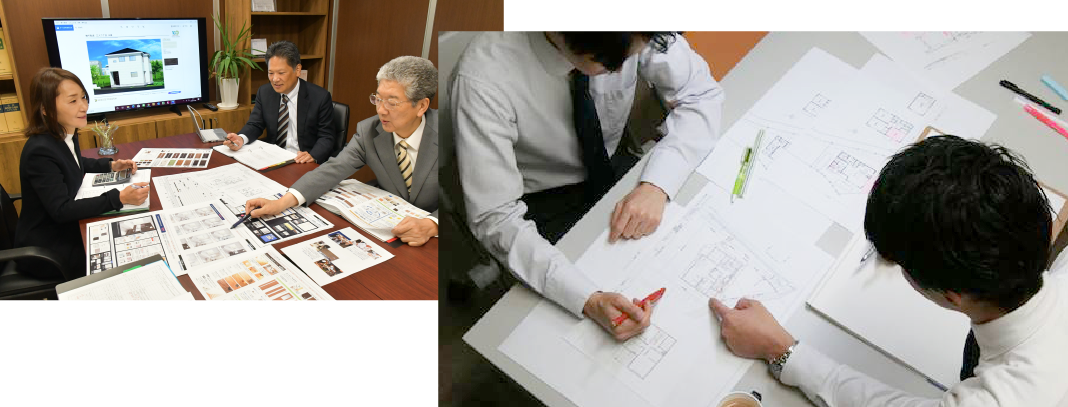 実際の土地の状況を把握し、その周辺環境なども含めてどのような家がお客様のメリットになるのかを当社スタッフで幾度も議論し計画を立てていきます。